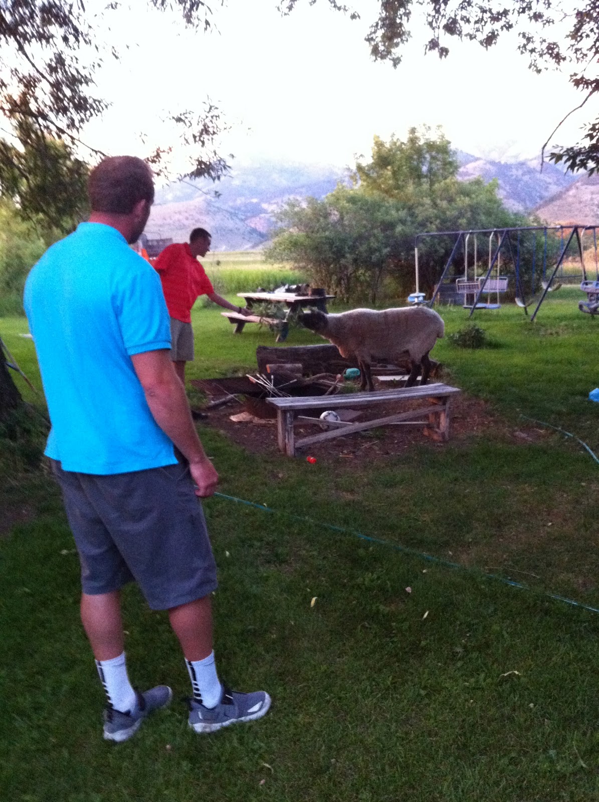 Mitch feeding their pet sheep, the sheep was fat huge and nasty.